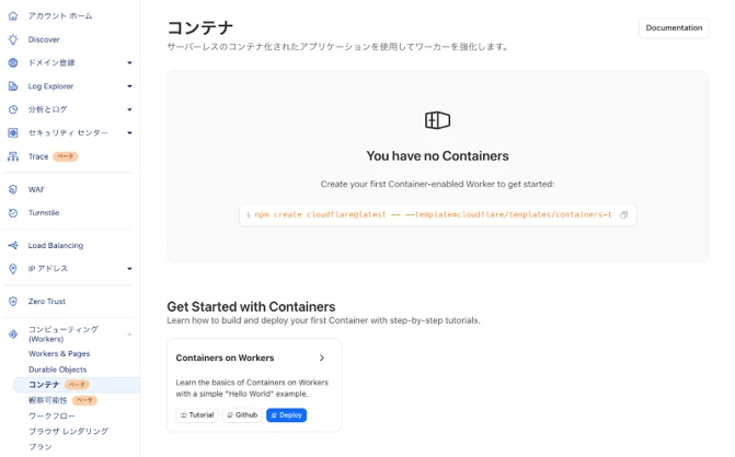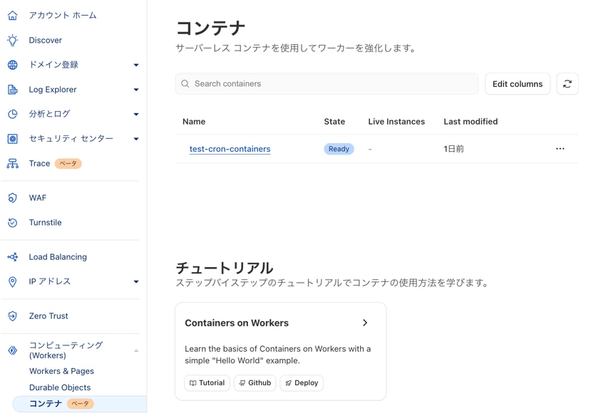 Cloudflare画面内の下記場所にて「コンテナ」が増えてることが確認できました。