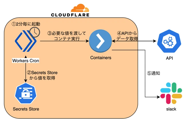 ① WorkersでCron Triggerを使用し、2分ごとに発火させます。