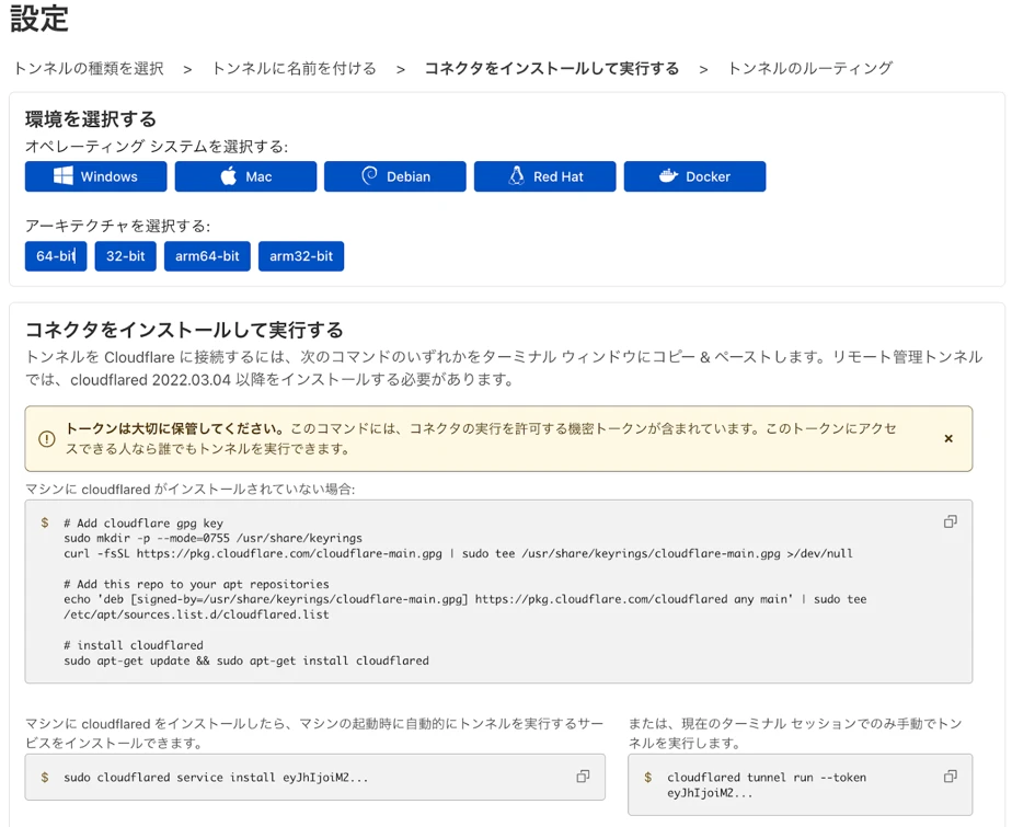 今回はUbuntuサーバにMySQLをインストールしましたので、「Debian」を選択して画面に記載してあるとおりにCloudflaredをインストールします。
