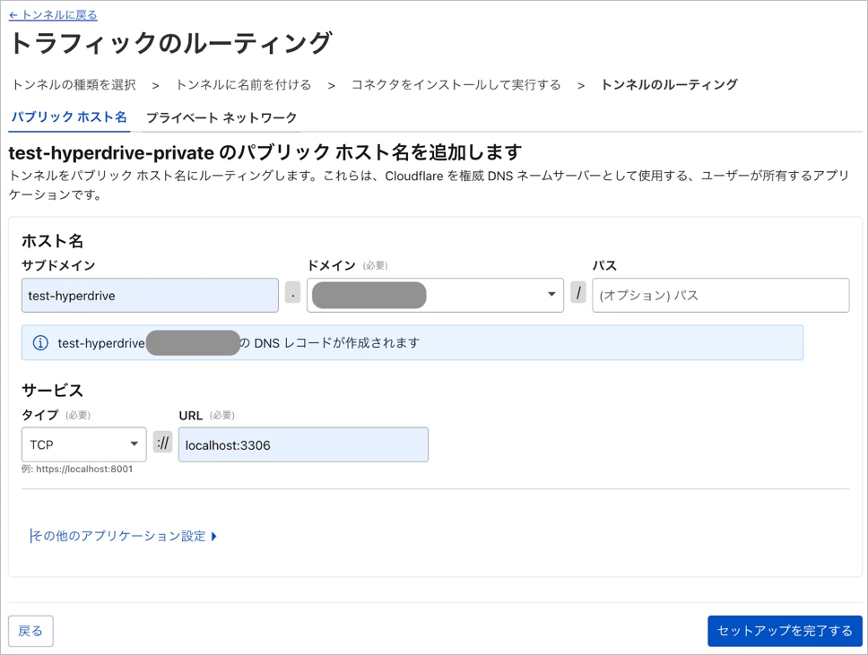 サービスは`TCP://localhost:3306`を設定して、「セットアップを完了する」をクリックします。