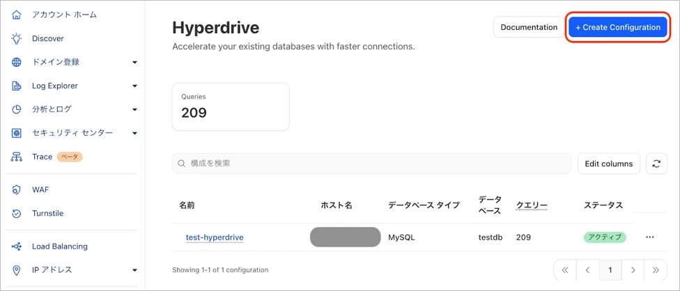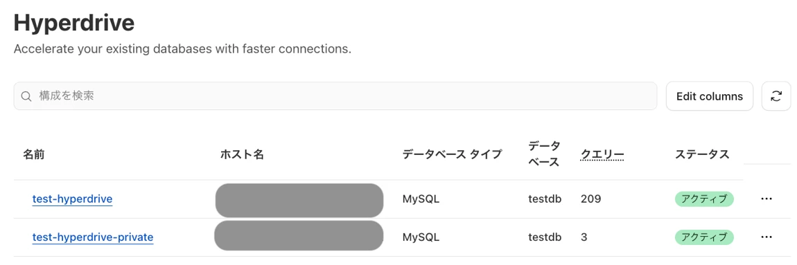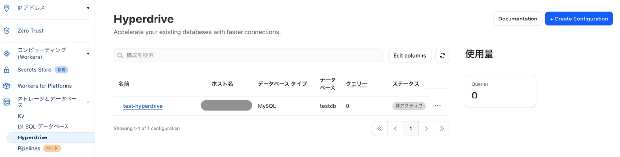 エラーにならなければ、以下のようにCloudflareの画面からHyperdriveの確認ができます。