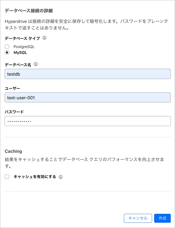 $ npx wrangler hyperdrive create test-hyperdrive --connection-string="mysql://test-user-001:パスワード@mysqlサーバの外部IP:3306/testdb" --caching-disabled