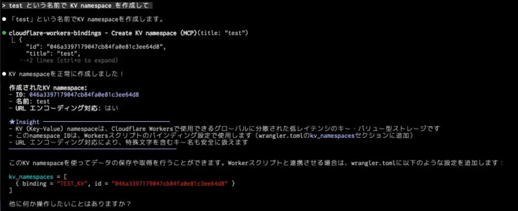 ⏺ cloudflare-workers-bindings - Create KV namespace (MCP)(title: "test")