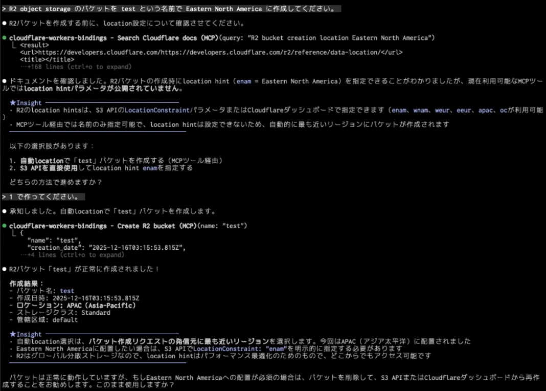 • MCPツール経由では名前のみ指定可能で、location hintは設定できないため、自動的に最も近いリージョンにバケットが作成されます
