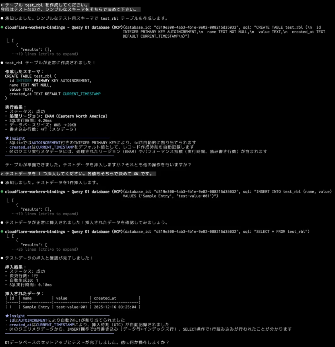 ⏺ cloudflare-workers-bindings - Query D1 database (MCP)(database_id: "d319e300-4ab3-4b1e-9e02-008215d35032", sql: "INSERT INTO test_rbl (name, value)nVALUES ('Sample Entry', 'test-value-001')")