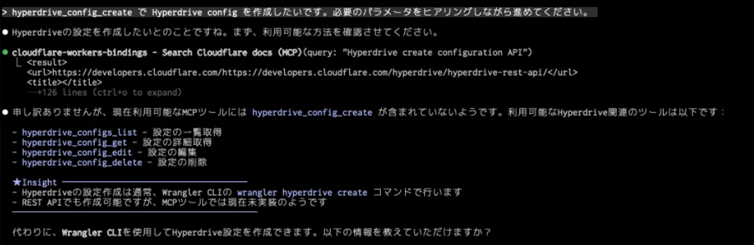 ⏺ 申し訳ありませんが、現在利用可能なMCPツールには hyperdrive_config_create が含まれていないようです。利用可能なHyperdrive関連のツールは以下です: