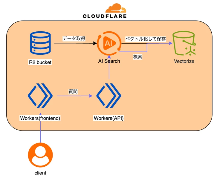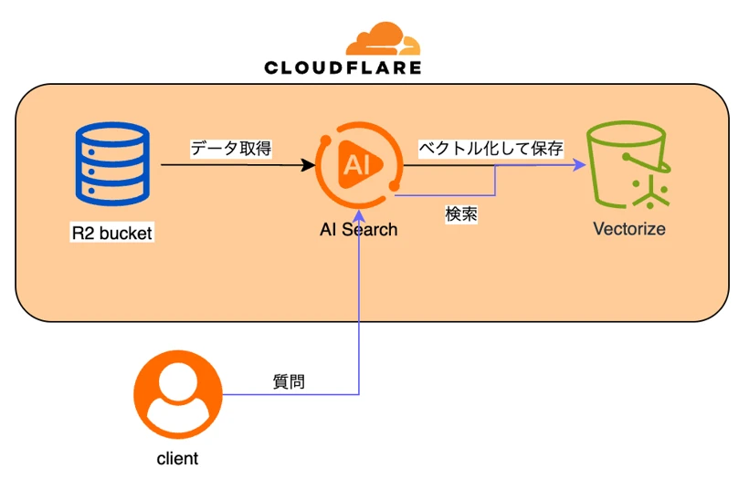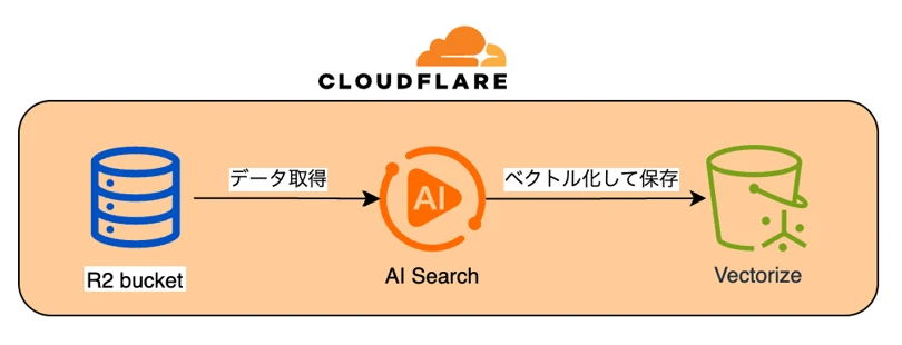 データ自体はCloudflare R2に保存され、その保存されたデータをベクトルに変換したものがCloudflare Vectorizeデータベースに保存される仕組みになっています。