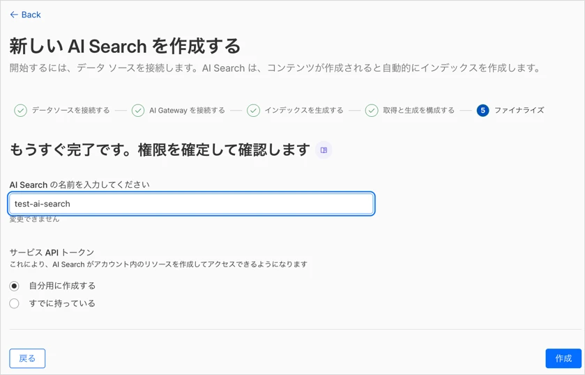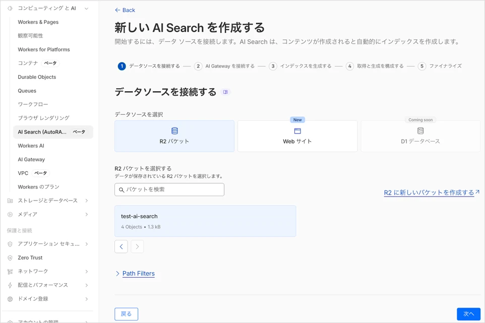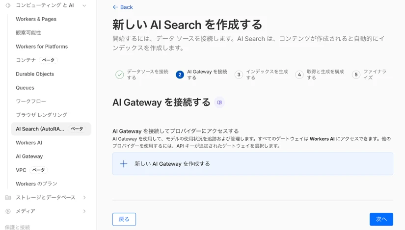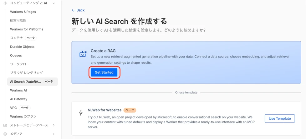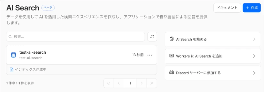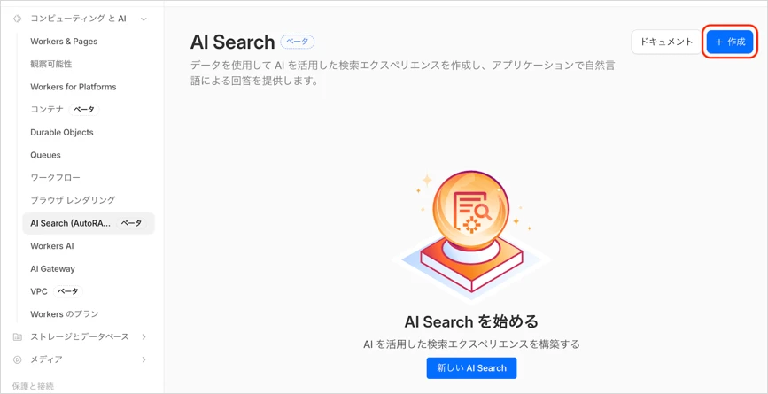 Cloudflareにログインして、コンピューティングとAI -> AI Searchに移動します。