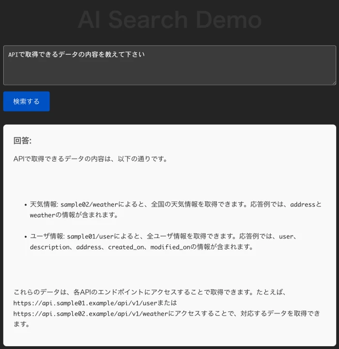 今回は架空のAPI情報をRAGとして読み込ませてAIから返答させてみます。