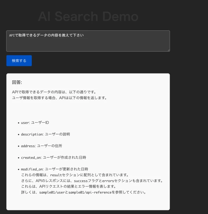 ブラウザからアクセスして、先ほどと同じ質問(「APIで取得できるデータの内容を教えて下さい」)を聞いてみます。