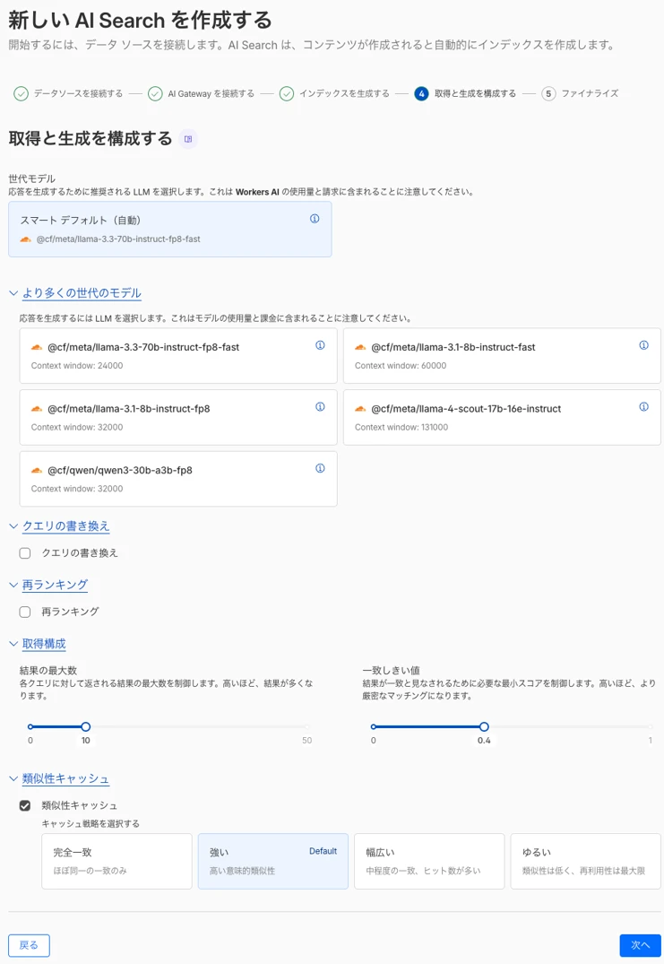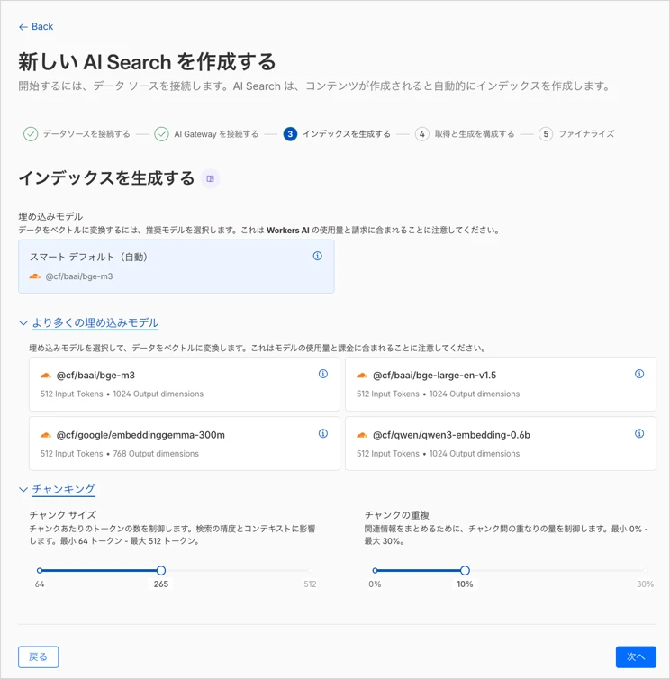 ここでは初期で選択されている「@cf/baai/bge-m3」を使用します。環境に合わせて選択して下さい。