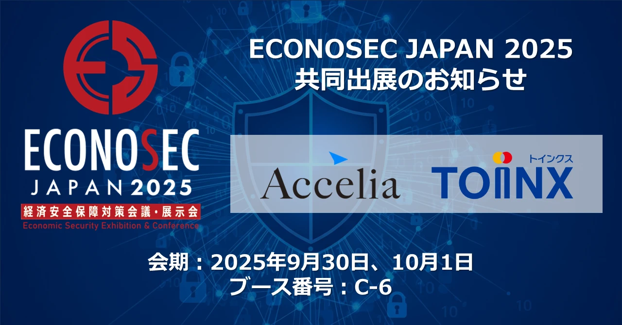 アクセリア株式会社(本社:東京都千代田区、代表取締役社長:牧野 顕道、以下 アクセリア)は、このたび株式会社トインクス(本社:宮城県仙台市青葉区、代表取締役社長:河田 伸、以下 トインクス)と共同で、2025年9月30日(火)、10月1日(水)に開催されるサイバーセキュリティイベント「ECONOSEC JAPAN 2025」に出展いたします。